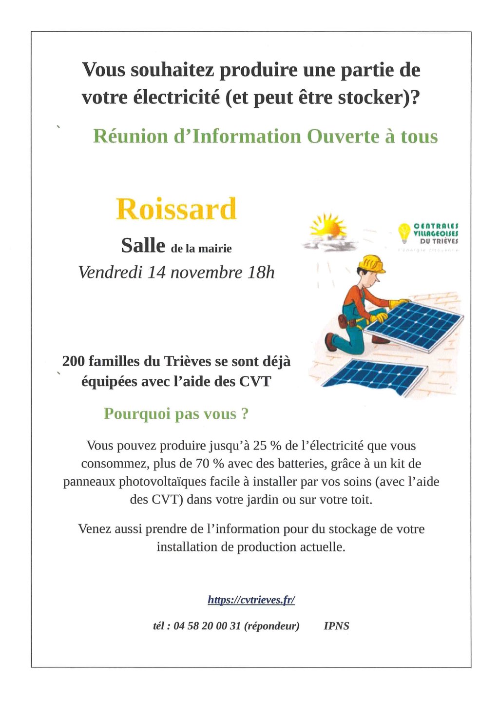 CENTRALES VILLAGEOISES DU TRIEVES l'énergie citoyenne, vous propose d'assister à la dernière réunion publique sur l'AutoConsommation Individuelle en Auto-Installation portée par les Centrales Villageoises du Trièves. 📣