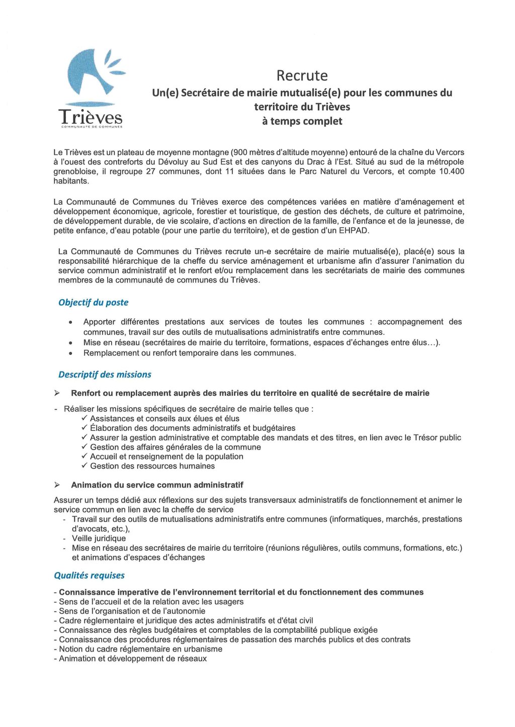 OFFRE D'EMPLOI SECRÉTAIRE DE MAIRIE MUTUALISÉ POUR LES COMMUNES DU TERRITOIRE DU TRIÈVES
