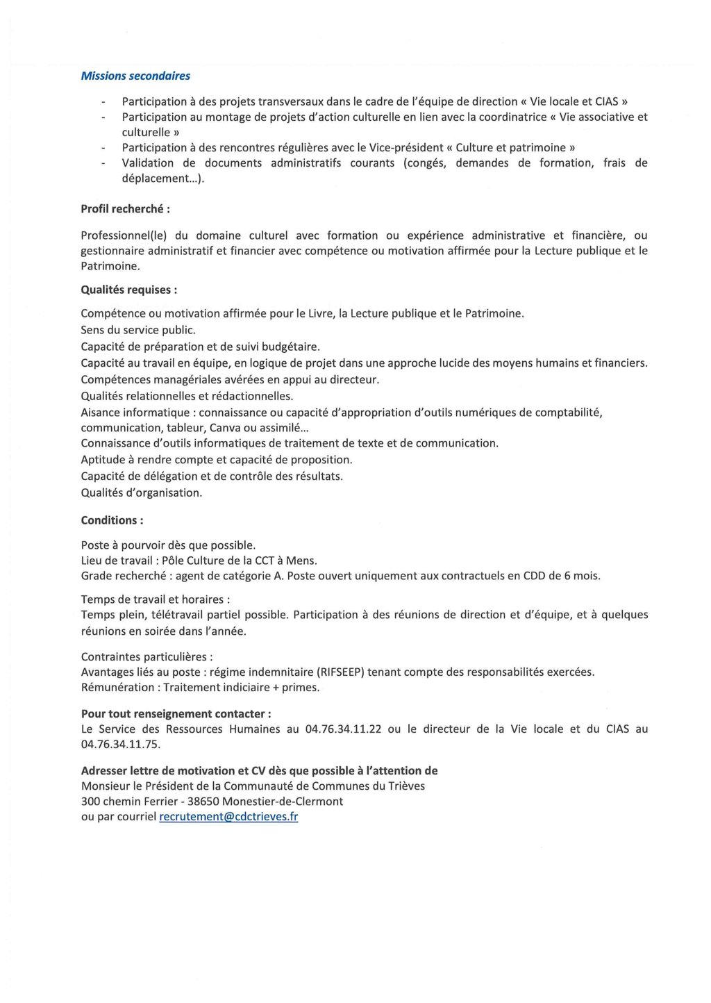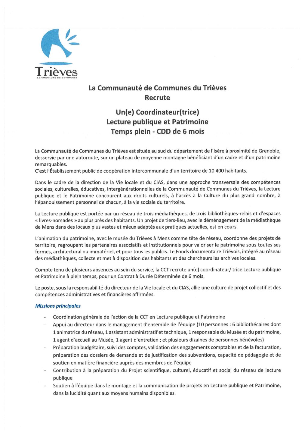 - Coordinateur Lecture publique et patrimoine - Temps plein - CDD 6 mois