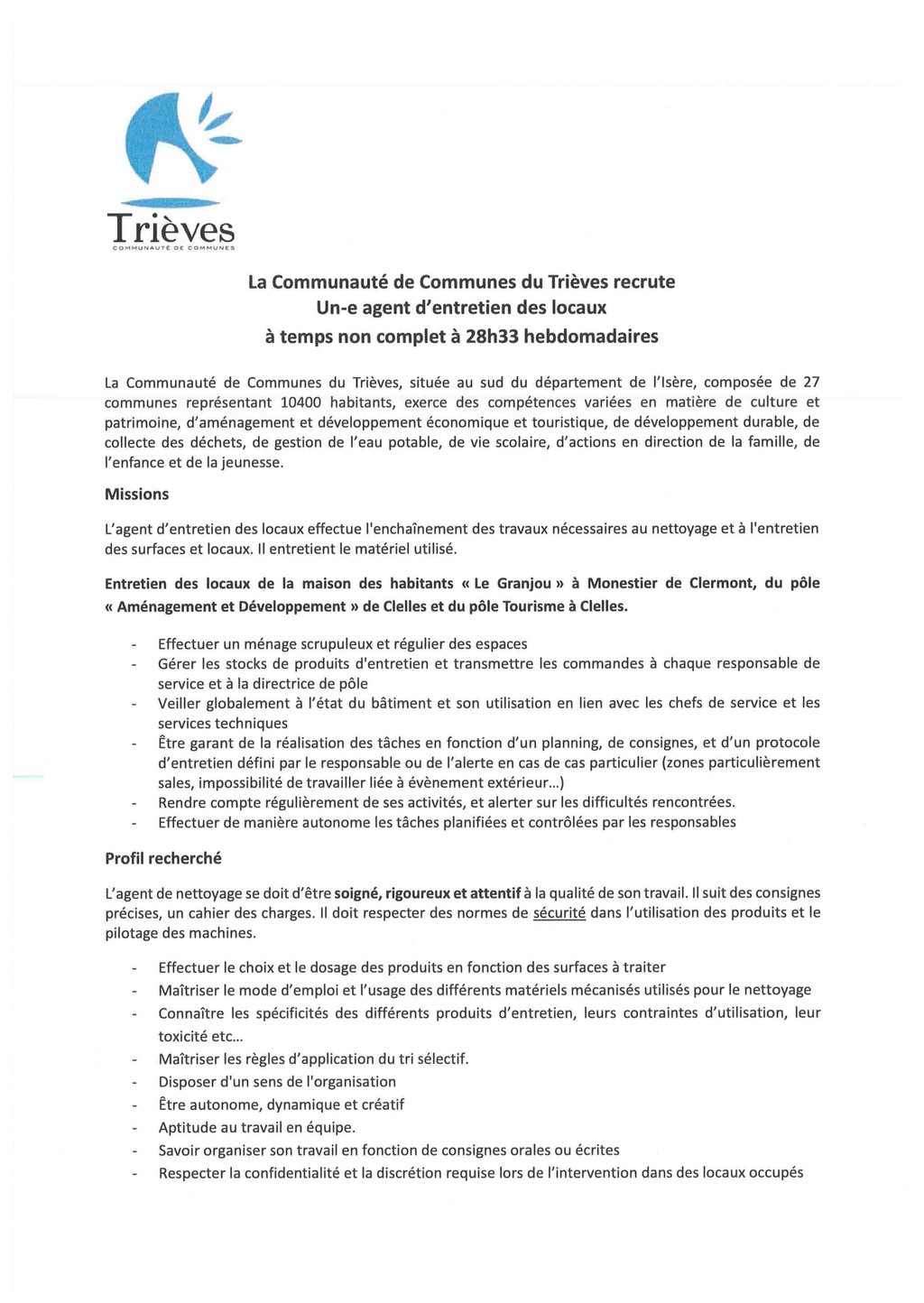 - Un-e agent d'entretien des locaux à temps non complet à 28h33 hebdomadaires