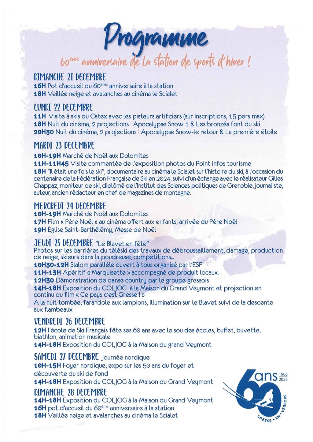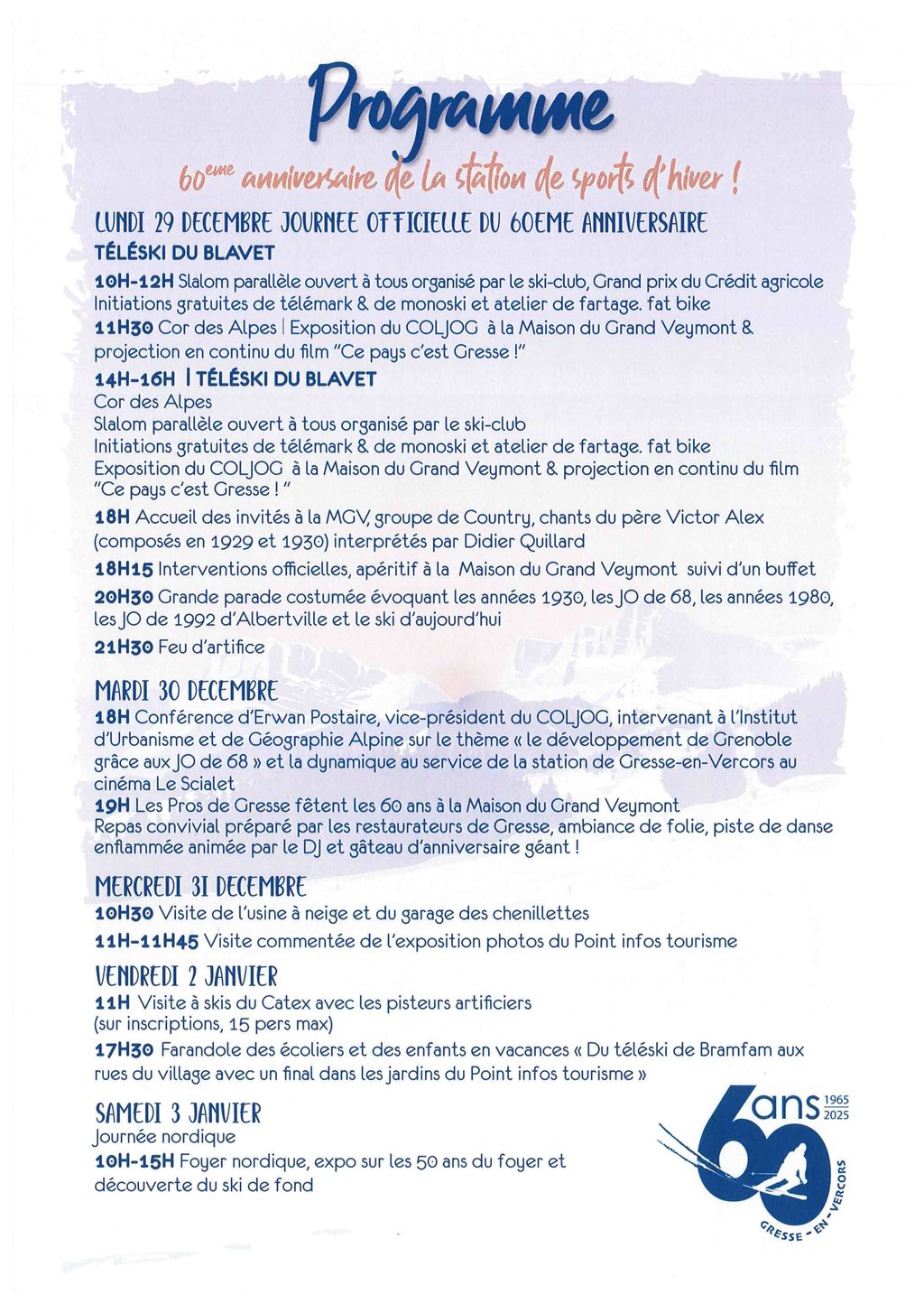 Vous trouverez en pièces jointes le livret d’accueil, le programme détaillé des 60ans de la station ainsi que les horaires des navettes pour accéder à Gresse-en-Vercors.